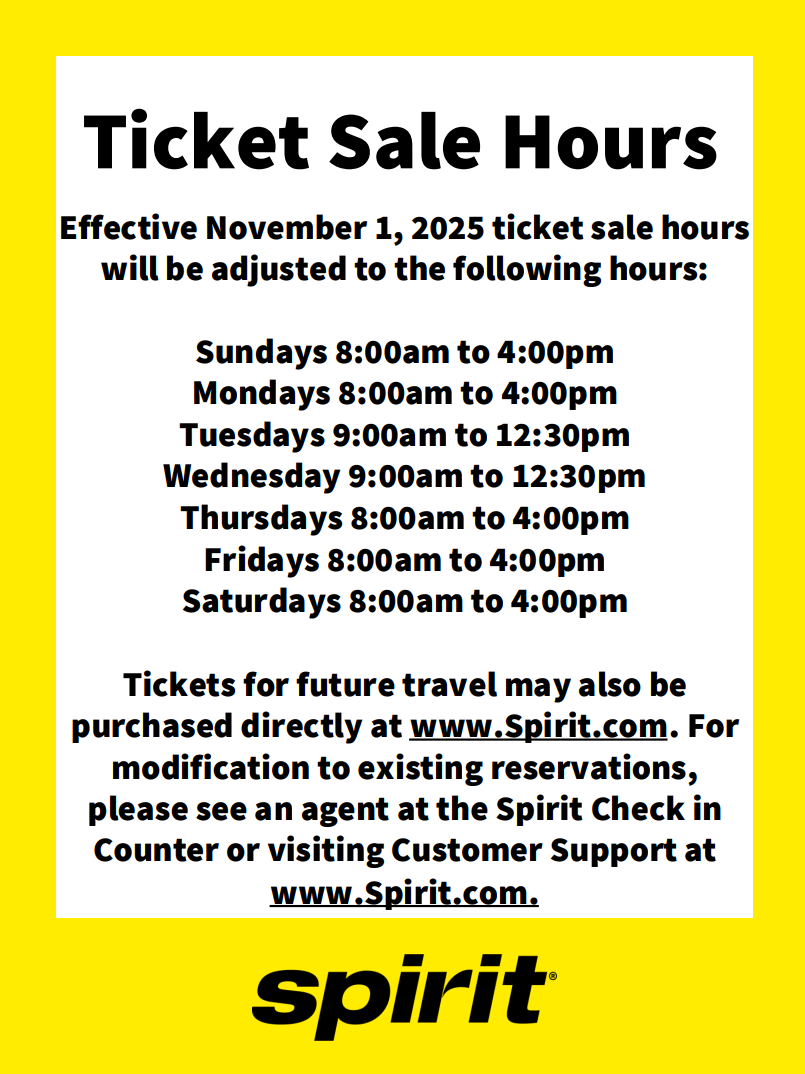 Spirit Ticket Sales Schedule Update - Effective November 1, 2025